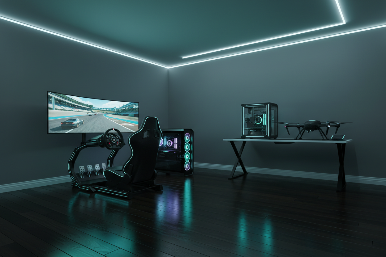 "One room. Limitless possibilities. Watch a simple desk setup evolve into a complete tech ecosystem featuring immersive racing simulation, aerial cinematography tools, advanced fabrication, and premium computing, all designed to elevate every project, every session, every creation.